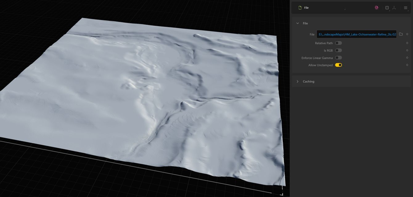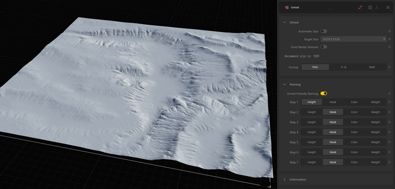 Für die Height Map nutzen wir das Format R16, für den Rest PNG, weil der Unreal Export-Knoten nur die Höhenkarte in der gewünschten Auflösung als R16 erstellt, den Rest in nur 1024*1024. Die Option PNG erzeugt allerdings auch in unserem Fall 8129*8129. Das ist der maximale Wert, den die UE fehlerfrei verarbeiten kann. Der Vorteil vom Export-Knoten ist der: man kann dort die nötigen Auflösungen für die UE per Drop Down einstellen und mit dem Plug In für die UE importieren, ohne irgendwas weiter tun zu müssen. Wir gehen hier aber den anderen Weg ohne Plug In. Wir wollen die volle Kontrolle behalten.