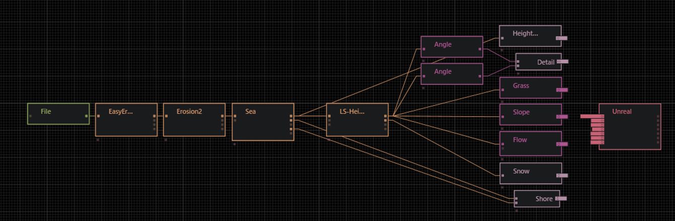 Jetzt müssen wir das Ergebnis in die UE bekommen. Unreal Node (unter Output zu finden) hilft. Dort müssen noch einige Inputs hinzugefügt werden, so dass wir eine Height Map und die gewünschten Masken für die späteren Landscape Layer haben. Exportiert wird in 2 Durchläufen, einmal als R16 und nochmal als PNG. Hintergrund: UE akzeptiert als Höhenkarte R16 (RAW-Formate bevorzuge ich immer, wo es geht) und PNG. Für die Landscape Layer (Gras, Felsen…) nur R8 und PNG. Und natürlich für alles RAW, aber dazu müssten wir uns noch JSON-Dateien bauen. Das lassen wir.