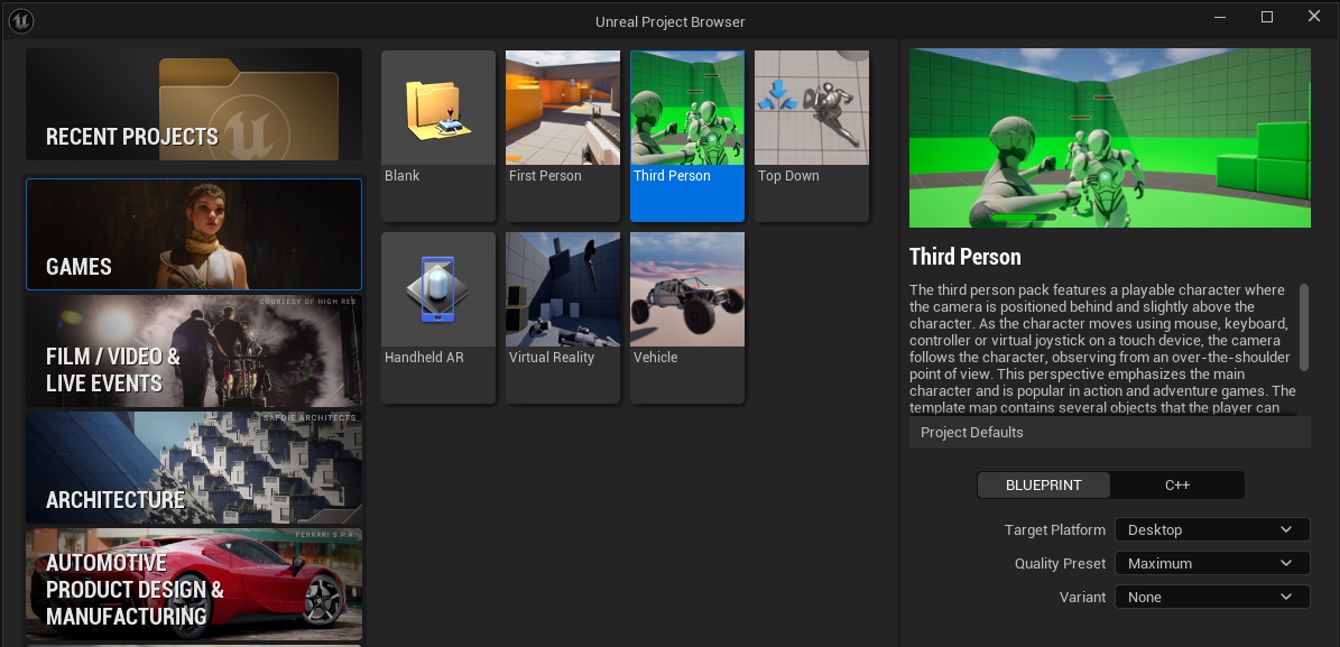 Zuerst legen wir ein neues Projekt in der Unreal Engine an, unter den Templates fällt meine Wahl auf Third Person. First Person funktioniert auch.  Der Grund dafür ist die Möglichkeit, World Partition als Technologie zu nutzen. Dazu später mehr. Ordner auswählen, einen sinnvollen Namen geben und speichern.
