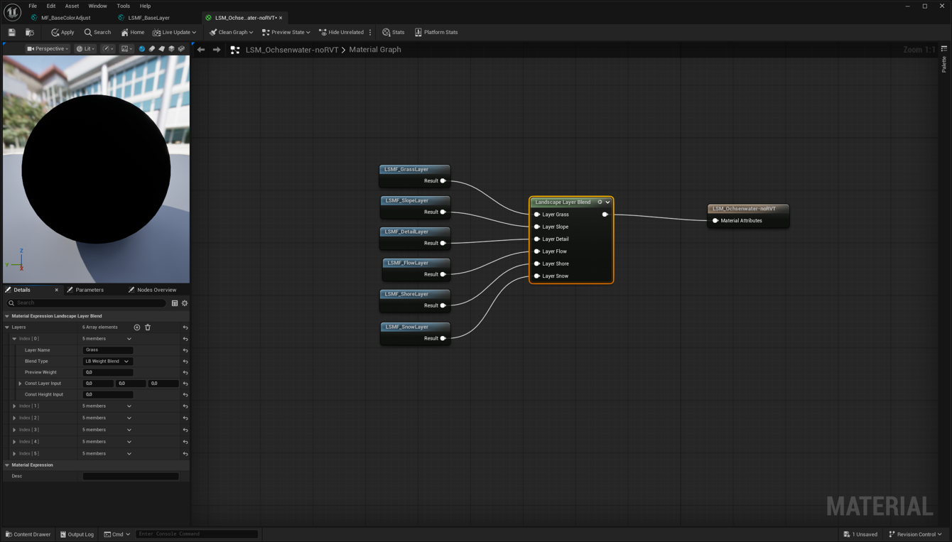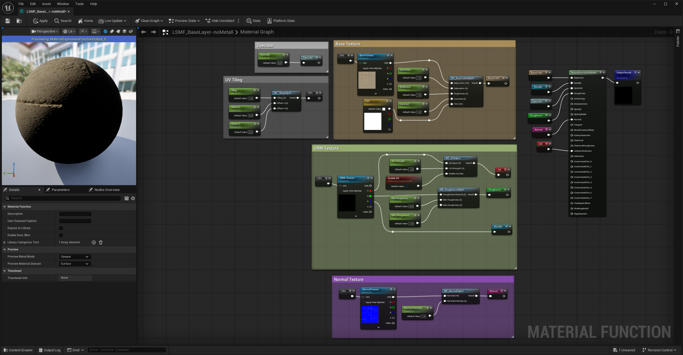 Wir bereiten unsere Landschafts-Materialien für die diversen Layer vor. Damit wir uns dran gewöhnen, arbeiten wir mit Material-Funktionen. Als erstes erstellen wir uns grundlegende Funktionen für Base Color, Roughness, Normal Strength, Ambient Occlusion usw. Später kommen diese auch in anderen Materialien zum Einsatz und werden um weitere Teile ergänzt.