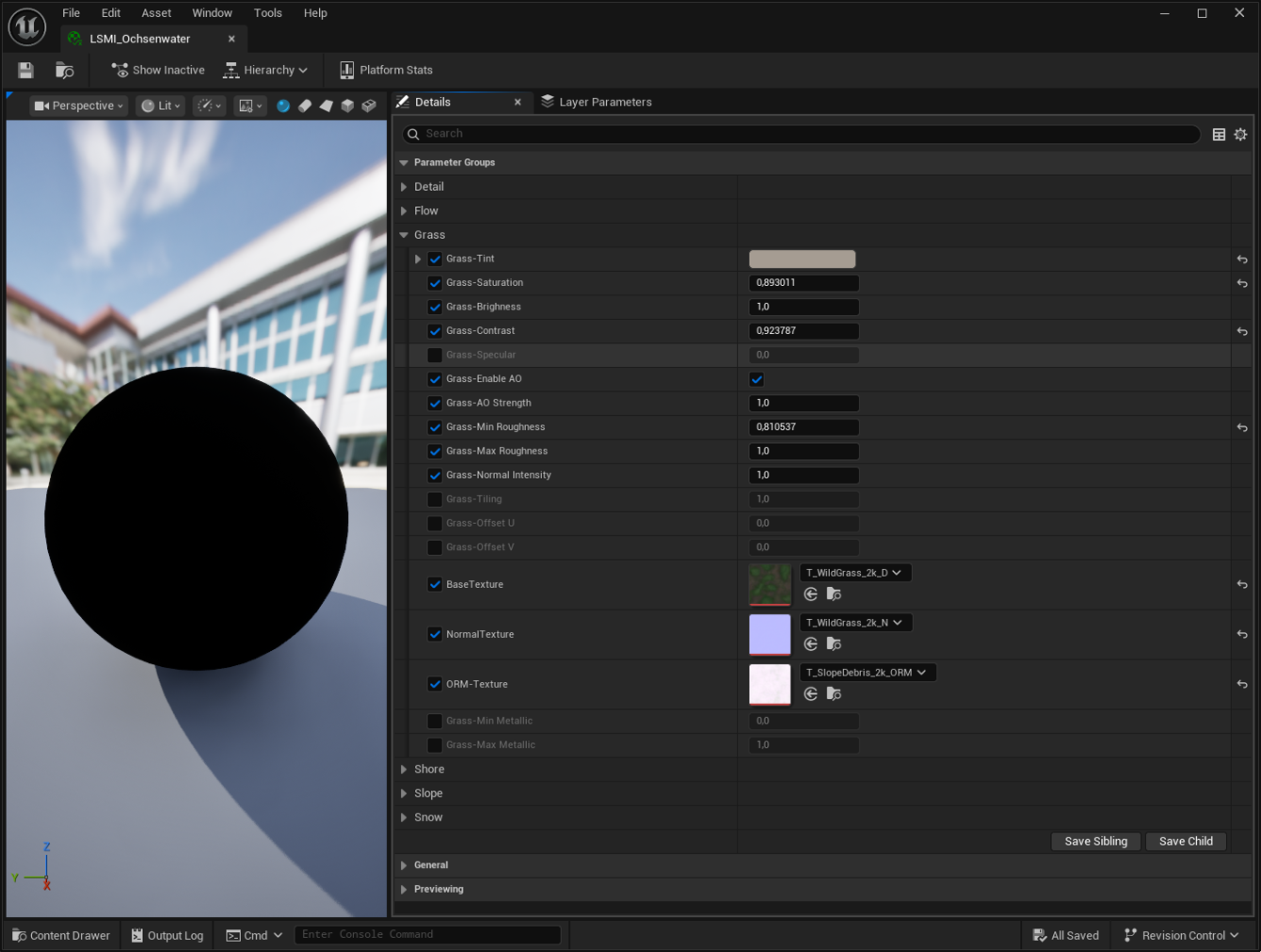 Siehe da, unsere zugewiesene Landscape Material Instance hat neue Einstellmöglichkeiten, die in Echtzeit und ohne zusätzliche Klicks sofort sichtbar sind. Dort können wir dann auch später Texturen tauschen.