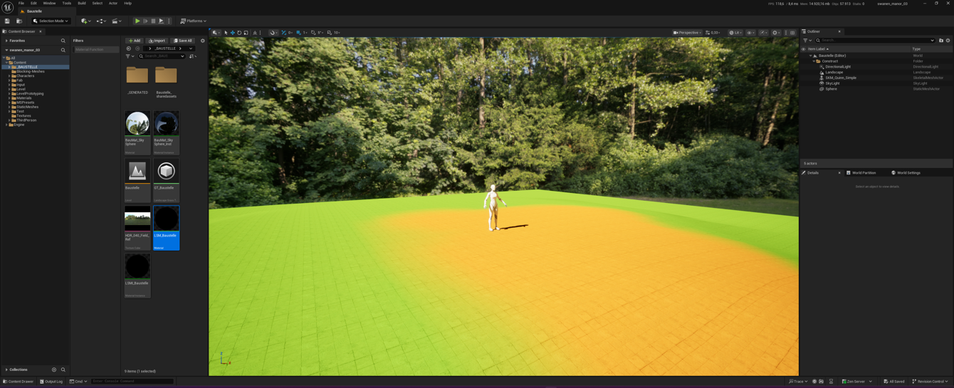 Wie gehabt erstellen wir uns übers Menü einen neuen Level. Ich hab den bei mir bewusst auf deutsch Baustelle genannt und dafür einen eigenen Ordner angelegt. Als Einstellung eine Empty World in Third Person. Da kommen die üblichen Verdächtigen rein wie Directional Light und SkyLight. Im Landscape Mode packen wir uns noch eine kleine flache Landschaft rein, ohne Heightmap Import. Und als Besonderheit diesmal noch eine einfache Sphere, zu finden unter Shapes ganz oben im Menü (das mit dem Würfel und grünem Plus). Das wird unser Horizont. Ganz nützlich ist auch eine Instanz von Manni oder Quinn zum checken der Größenverhältnisse unserer Objekte.