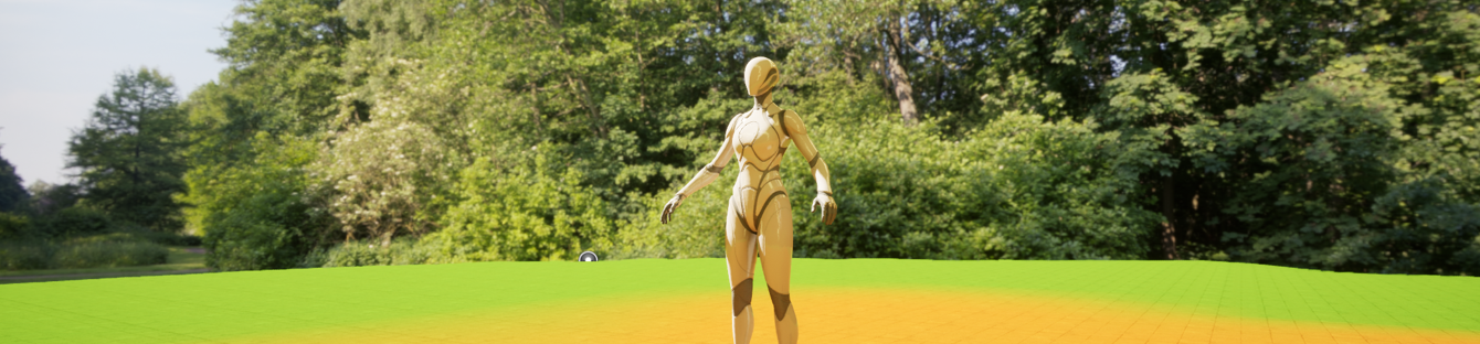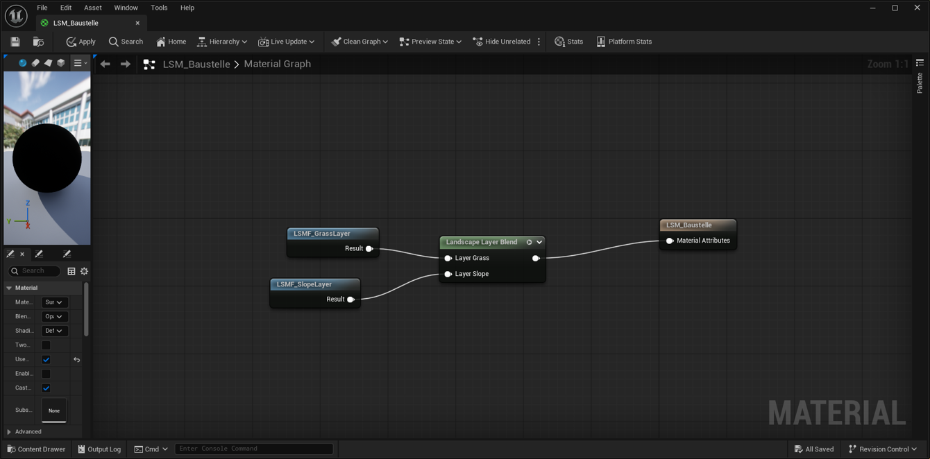 Wir basteln uns ein neues Material, hier reichen zwei Layer. Wir nutzen unsere bereits existierenden Grass- und Slope-Funktionen, weisen die Instanz der Landschaft zu, Shader erstellen. Und schon können wir im Paint Mode drauf rum malen, ohne die Landschaft in unserer richtigen Welt zu beeinflussen. Wir können auch ein wenig im Sculpt Mode moddeln. Ich hab eine leichte Erhebung für spätere Häuser geformt.