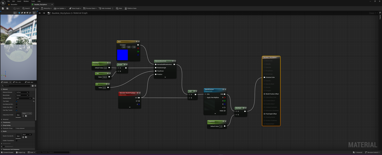 Wichtig ist eine Datei mit „.hdr“ am Ende. Und dann die mit „Ref“ im Namen. Die packen wir ins Material für unsere Sphere, mit ein paar Modifikationen können wir das in der Materialinstanz drehen und die Helligkeit anpassen. Wir haben einen anpassbaren Horizont.