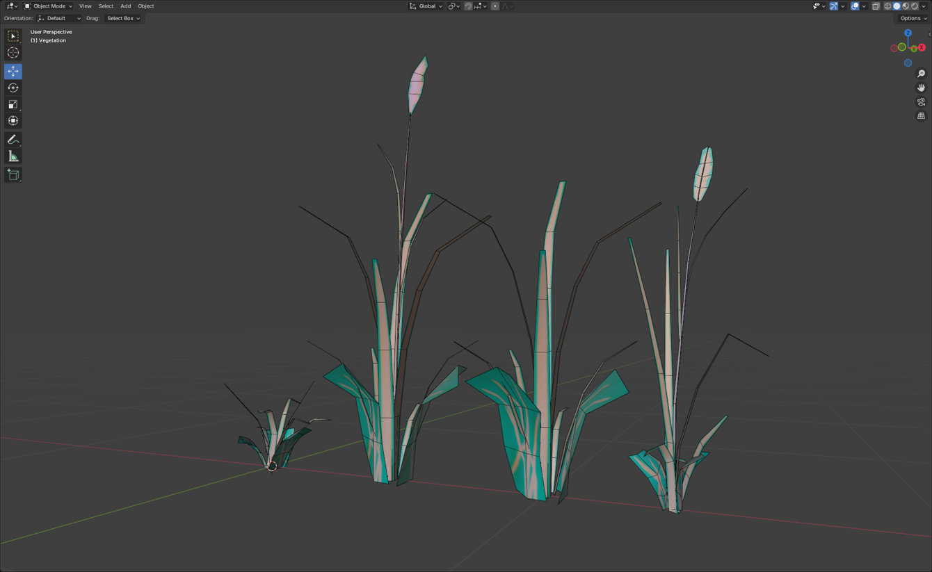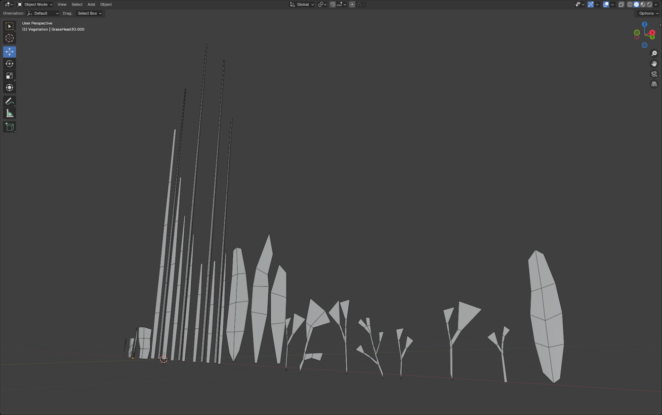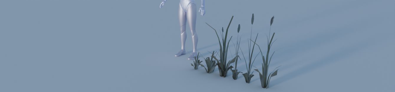 Zurück im Object und wahlweise Edit Mode werden die Teile dupliziert, skaliert, gebogen und in Form und Position gebracht, sodass wir einige Variationen von einzelnen Büscheln haben. Die einzelnen Ergebnisse werden zu Objekten zusammen gefasst (STRG+J), ein eindeutiger Name vergeben (Richtlinien zu Namenskonventionen stehen in der Dokumentation der UE) und gespeichert. Größere Flächen daraus bauen wir später in der UE zusammen.