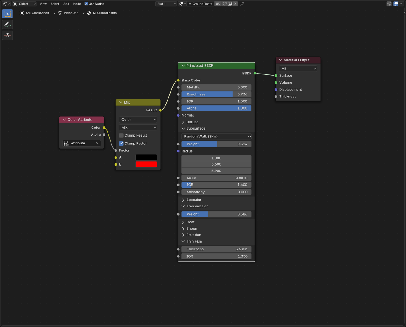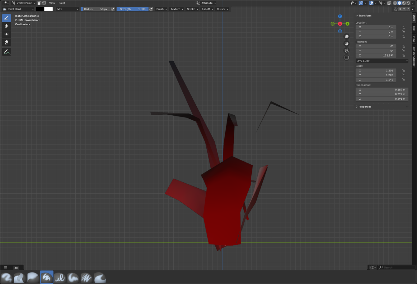Da die künftigen Wiesen etwas lebendiger wirken und die Grashalme und Blätter sich im Wind wiegen sollen, sind noch einige Schritte im Blender nötig. Wir wechseln bei jedem Grasbüschel in den Weight Paint Mode, schalten in eine Seitenansicht und packen mit dem Gradient Tool einen Verlauf darüber. Der rote Teil wird sich später gar nicht bewegen, der mehr in Richtung blauer Teile dagegen umso mehr.